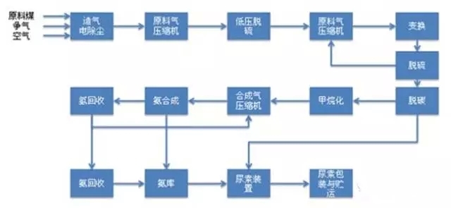 煤制化肥工藝流程由備煤、氣化、變換、低溫醇洗、合成氣壓縮、氨合成、二氧化碳?xì)怏w、尿素合成、尿素結(jié)晶造粒幾個(gè)部分組成。原料煤經(jīng)過粉碎或水磨處理后送入氣化爐,(目前主要有魯奇固定床氣化爐、德士古水煤漿氣化爐、shell分煤氣化爐)制成合成氣后,采用濕法脫硫工藝回收硫磺,將工藝氣體補(bǔ)入氮?dú)?,使工藝氣體氮?dú)浔壤秊?,在鐵作催化劑下,合成氨氣。氨氣液化后液相加氣相物料總NH3/CO2(摩爾比)約為2.9,溫度為165℃~170℃送入尿素合成塔,尿素進(jìn)行精餾蒸發(fā)后制得商品尿素。