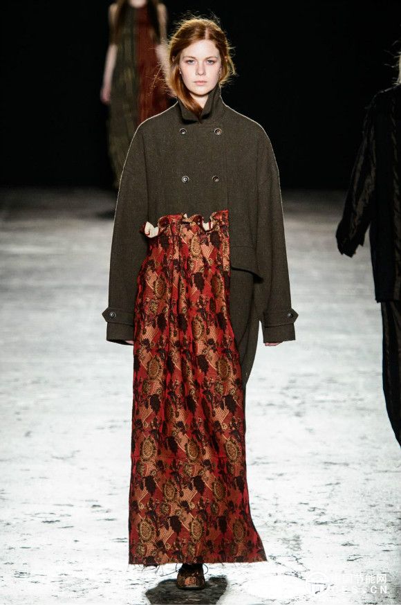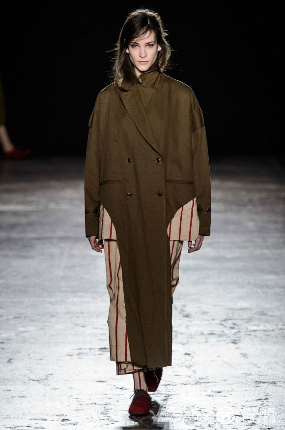 就在幾天前,王汁照舊把新一季時(shí)裝周辦在了米蘭。模特在帶有不祥預(yù)感的開場音樂下急速步入,她們身上的帝國軍裝與華麗錦緞沖撞出一股決絕的浪漫主義氣息。設(shè)計(jì)師將黯啞與光澤的面料融合進(jìn)她不規(guī)則的形狀條塊中,細(xì)條紋上的中國情調(diào)無疑是個(gè)撩撥人心的細(xì)節(jié)。