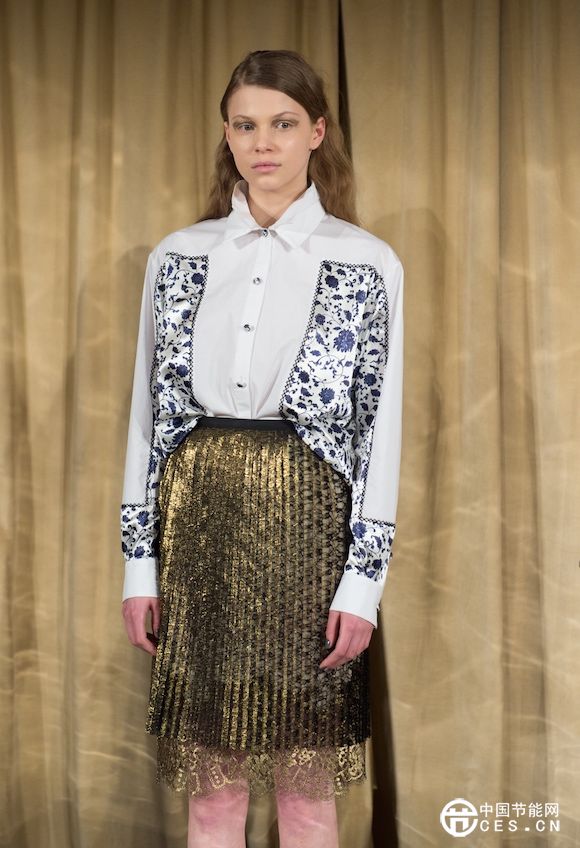 在本季倫敦時(shí)裝周上呼聲頗高的李筱與張卉山被安排在關(guān)鍵的時(shí)間位——緊隨本地品牌 Jonathan Sauders、Richard Nicoll 和 Meadham Kirchhoff 后發(fā)布。曾在 Dior 高定工坊磨練過的張卉山已擺脫早期對于中國風(fēng)格的運(yùn)用,呈現(xiàn)出更普適的女裝觀念。就拿這次秋冬系列為例,他將印花絲綢以集合拼貼的形式呈現(xiàn)出來,靈感來自中國瓷器。從波爾道夫到布朗斯百貨,他的時(shí)裝如今可以很驕傲地和 Giambattista Valli、Emlia Wickstead、Erdem 等品牌并立。