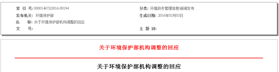 環(huán)保部發(fā)布,關(guān)于環(huán)境保護部機構(gòu)調(diào)整的回應(yīng),詳情如下: