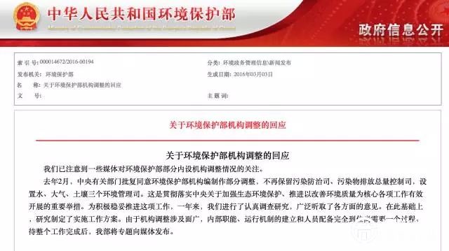 2016年3月3日上午,網傳環(huán)保部召開了 “水、氣、土三司成立暨干部任職宣布大會”,并列出了三位司長的名字。下午,環(huán)保部官方網站發(fā)布《關于環(huán)境保護部機構調整的回應》,稱: