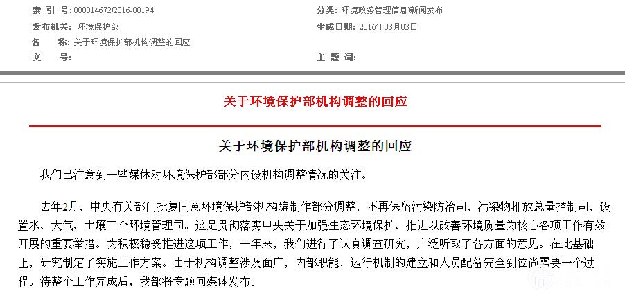據(jù)環(huán)保部介紹,去年2月,中央有關部門批復同意環(huán)保部機構編制作部分調整,不再保留污染防治司、污染物排放總量控制司,設置水、大氣、土壤三個環(huán)境管理司。