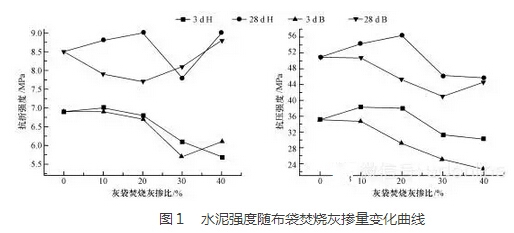 兩種廢舊布袋焚燒灰不同摻配比水泥所表現(xiàn)出的強(qiáng)度變化規(guī)律,可總體上表述為:化纖布袋灰水泥在摻量小于20%時,其抗折抗壓強(qiáng)度都達(dá)到甚至超過同齡期S號參照水泥。 當(dāng)化纖布袋焚燒灰摻量大于30%時,化纖布袋灰水泥強(qiáng)度大幅下降;玻纖布袋灰水泥隨著摻量的遞增,其強(qiáng)度在總體上呈遞減趨勢,抗折和抗壓強(qiáng)度曲線呈現(xiàn)U型變化規(guī)律. 玻纖布袋灰水泥28d強(qiáng)度遞減幅度小于3d強(qiáng)度遞減幅度。