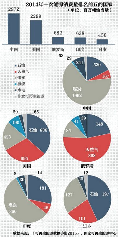 2014年,中國的一次能源消費(fèi)量比排名第二的美國多673百萬噸油當(dāng)量。而從能源結(jié)構(gòu)來看,中國的能源消費(fèi)還是以煤炭為主,消費(fèi)量占整體用量的將近三分之二。對比其他能源消費(fèi)大國,美國能源消費(fèi)以石油和天然氣為主,俄羅斯主要用天然氣,印度以煤炭為主,而日本則主要用石油。