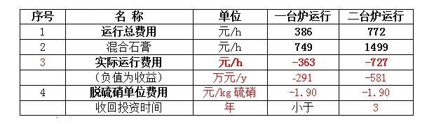 以上案例結(jié)果表明,達(dá)到煙氣超低排放指標(biāo),粉塵5mg/Nm3,二氧化硫35mg/Nm3, 氮氧化物50mg/Nm3,抵消所有運(yùn)行費(fèi)用后,副產(chǎn)品銷售每年能賺取580萬(wàn)元,預(yù)測(cè)3年內(nèi)能收回工程投資。
