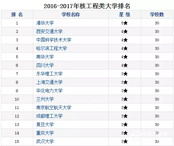 2016年2月23日,中國科學(xué)評價研究中心(RCCSE)、武漢大學(xué)中國教育質(zhì)量評價中心聯(lián)合中國科教評價網(wǎng)隆重推出《2016年中國大學(xué)及學(xué)科專業(yè)評價報告》。發(fā)布了中國大學(xué)本科專業(yè)類排行榜,共涉及92個本科專業(yè)類。下面分別公布2016-2017年中國核工程專業(yè)類本科大學(xué)排行榜的前15強(3星以內(nèi))名單。
