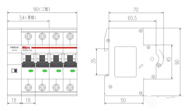 FAR6- W采用模塊化設(shè)計(jì),其結(jié)構(gòu)是驅(qū)動模塊加微型斷路器。驅(qū)動模塊僅18mm寬度,單相加N總寬度54mm,三相加N總寬度90mm。在業(yè)內(nèi)率先突破單極 18mm寬,最大額定工作電流100A。小巧的體積保證了FAR6-W可方便地安裝于現(xiàn)有的標(biāo)準(zhǔn)計(jì)量箱中。