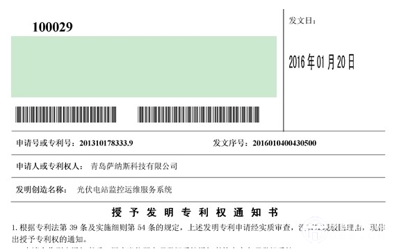 薩納斯“光伏電站監(jiān)控運(yùn)維服務(wù)系統(tǒng)”獲發(fā)明專利權(quán)