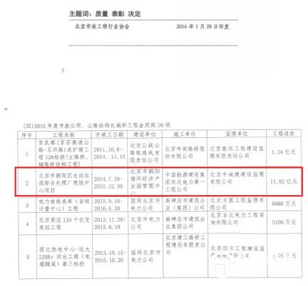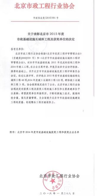 核心提示:2016年3月10日北京市政工程行業(yè)協(xié)會(huì)發(fā)布《關(guān)于表彰北京市2015年度市政基礎(chǔ)設(shè)施長城杯工程及獲獎(jiǎng)單位的決定》(市政協(xié)會(huì)發(fā)[2016]001號(hào))文件,正