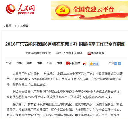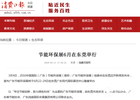 由廣東省環(huán)保廳、中國(guó)國(guó)際貿(mào)易促進(jìn)委員會(huì)廣東省委員會(huì)支持,由東莞市政府特別支持的“2016中國(guó)國(guó)際(廣東)節(jié)能環(huán)保展暨新能源博覽會(huì)”,將于6月22日至24日在東莞廣東現(xiàn)代國(guó)際展覽中心舉辦,讓民眾的期待感爆棚。