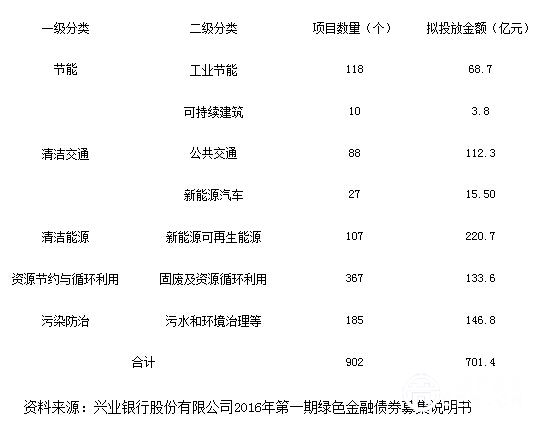 從興業(yè)銀行綠色金融業(yè)務(wù)發(fā)展來看,近年來,興業(yè)銀行綠色金融業(yè)務(wù)高速發(fā)展,根據(jù)興業(yè)銀行股份有限公司2016年第一期綠色金融債券募集說明書披露,截至2015年9月末,綠色金融融資余額3729.83億元,主要投放于節(jié)能減排、污染防治、清潔能源等項(xiàng)目領(lǐng)域。興業(yè)銀行計(jì)劃將綠色信貸更多支持新能源可再生能源、污水和環(huán)境治理、固廢及資源循環(huán)利用以及公共交通等領(lǐng)域。