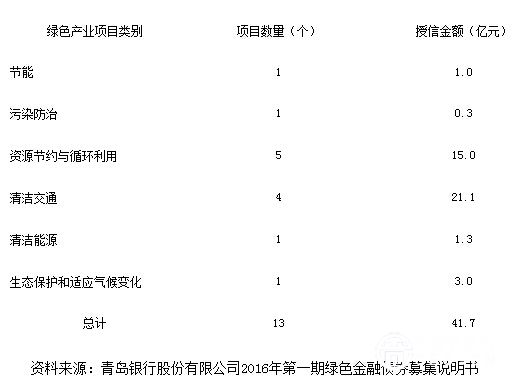 青島銀行綠色信貸業(yè)務(wù)起步于2013年,根據(jù)青島銀行股份有限公司2016年第一期綠色金融債券募集說明書披露,截至2014年末,青島銀行綠色信貸項(xiàng)目授信用信余額為19.58億元,主要投放于城市新能源公共汽車、資源循環(huán)利用、小型農(nóng)田水利設(shè)施建設(shè)、垃圾處理和污染防治以及節(jié)能環(huán)保服務(wù)等領(lǐng)域。