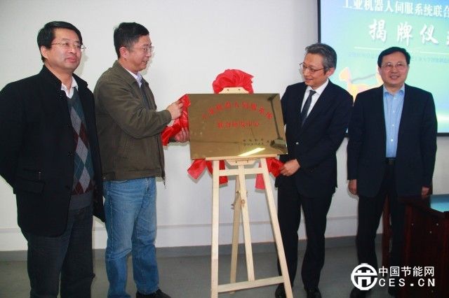 合肥工業(yè)大學副校長劉志峰、合肥工業(yè)大學智能制造研究院書記鄭學慧、安徽松科信息科技有限公司總裁余東、安徽省經(jīng)信委副主任吳韋人(自左向右)共同為“工業(yè)機器人伺服系統(tǒng)研發(fā)中心”揭牌