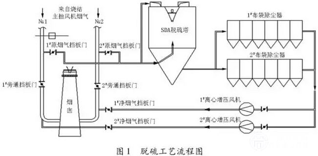 江蘇永鋼集團聯(lián)峰鋼鐵300m²燒結(jié)機使用的是丹麥Niro公司SDA法煙氣脫硫工藝,采用石灰作為脫硫劑。設(shè)置脫硫裝置前,燒結(jié)機機頭煙氣經(jīng)電除塵器除塵后,由燒結(jié)主抽風(fēng)機引入主煙囪排放。設(shè)置脫硫裝置后,原煙氣由燒結(jié)主抽風(fēng)機出口煙道頂面垂直引出,經(jīng)旁路擋板門和原煙氣擋板門切換后,送入旋轉(zhuǎn)噴霧干燥(SDA)吸收塔,與被霧化的石灰漿液接觸,發(fā)生物理、化學(xué)反應(yīng),氣體中的SO²被吸收凈化。