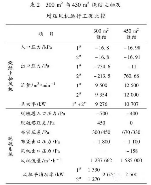300m²燒結(jié)機脫硫系統(tǒng)使用兩臺離心增壓風(fēng)機,增壓風(fēng)機采用定速運行,風(fēng)量由風(fēng)門控制,正常開度約為30%,并聯(lián)運行功率分別為1270kW和1330kW,單位燒結(jié)機面積功率消耗為8.67kW/m²。該廠450m2燒結(jié)機同樣也是采用SDA法煙氣脫硫工藝,但使用一臺軸流增壓風(fēng)機,運行功率為500kW,單位燒結(jié)機面積功率消耗為5.56kW/m²。兩臺燒結(jié)機脫硫增壓風(fēng)機運行工況對比見表2。從中可見,300m²燒結(jié)煙氣脫硫增壓風(fēng)機的單位功耗要比450m²燒結(jié)系統(tǒng)高55.9%,出現(xiàn)了嚴重的功率倒掛,說明該脫硫增壓風(fēng)機有很大的節(jié)能空間。