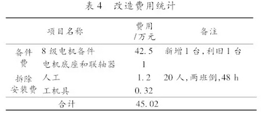 按照上述8級電機替6級電機的改造方案,8級電機選型為YBKK630-8,900kW,與原6級電機相比,中心高度、輸出軸頸和軸伸長度不同,需重新制作電機底座和聯(lián)軸器。由于庫房已有一臺同型號8級電機,因此僅新購了一臺電機。備件到位后,于2015年1月7~8日實施了改造。包括:拆除原電機、底座、聯(lián)軸器,安裝新電機、底座和聯(lián)軸器。此次改造共花費45.02萬元,其中不含利舊的一臺電機,具體費用見表4。