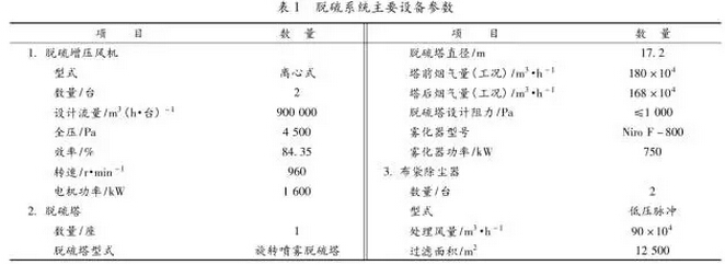 經(jīng)吸收SO²并干燥的含粉料煙氣出吸收塔進入布袋除塵器進行氣固分離,凈煙氣由脫硫增壓風(fēng)機抽引至燒結(jié)主煙囪,排入大氣。脫硫增壓風(fēng)機采用了兩臺離心風(fēng)機,脫硫工藝流程見圖1。脫硫系統(tǒng)主要設(shè)備參數(shù)見表1。