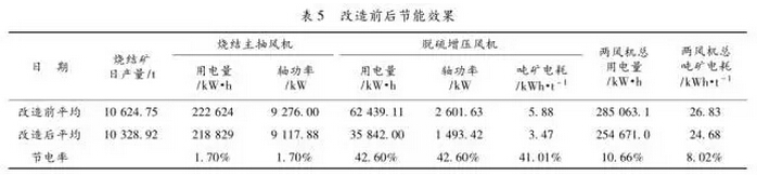 由表5可知,改造后300m²燒結(jié)兩臺脫硫增壓風(fēng)機的平均功率由2601.63kW降至1493.42kW,節(jié)電42.6%。為了避免生產(chǎn)工況波動對燒結(jié)主抽風(fēng)機和脫硫增壓風(fēng)機功率分配的影響,將主抽風(fēng)機和脫硫風(fēng)機總功率合并計算后發(fā)現(xiàn),改造后平均總功率降低了10.66%,折合噸礦節(jié)電2.15kWh。按年產(chǎn)330萬t燒結(jié)礦計算,年節(jié)電約709.5萬kWh,按0.6元/kWh計算,年節(jié)約電費425.7萬元,效益顯著。