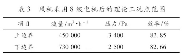 由表2可知,目前脫硫系統(tǒng)運行時布袋出口壓力為-1800Pa,流量為1237662m³/h,考慮壓力測量較流量測量誤差小,故可將其作為設(shè)計需要保證的數(shù)據(jù)。新風(fēng)機在脫硫系統(tǒng)出口必須能夠提供高于-1800Pa的負壓,才能保證脫硫系統(tǒng)在當(dāng)前工況下運行;如果再考慮風(fēng)機進出口煙道損失,新風(fēng)機全壓最低應(yīng)大于2500Pa。由性能曲線可知,在全壓2500Pa時,兩臺風(fēng)機采用8級電機后能夠提供的總風(fēng)量為2×730000m³/h,滿足300m²燒結(jié)生產(chǎn)需求。風(fēng)機采用8級電機后,其理論工況點范圍見表3。