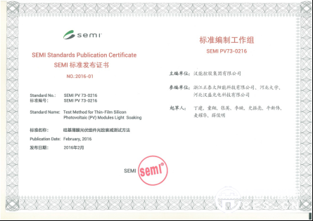 近日,由漢能控股集團(tuán)有限公司(以下簡稱漢能控股)主導(dǎo)編制的《硅基薄膜光伏組件光致衰退測(cè)試方法》(SEMI PV 73-0216)正式發(fā)布,并獲得SEMI頒發(fā)的標(biāo)準(zhǔn)證書。與此同時(shí),漢能控股還在主編《柔性薄膜光伏組件卷曲測(cè)試方法》SEMI國際標(biāo)準(zhǔn)、《銅銦鎵硒薄膜光伏組件》國家標(biāo)準(zhǔn)和我國建筑工業(yè)產(chǎn)品行業(yè)標(biāo)準(zhǔn)《建筑用柔性薄膜光伏組件》。其中,《銅銦鎵硒薄膜光伏組件》國家標(biāo)準(zhǔn)將是我國首個(gè)專門針對(duì)銅銦鎵硒薄膜光伏組件的國家標(biāo)準(zhǔn)。