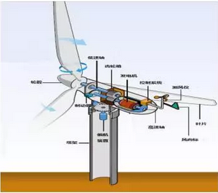 典 型現(xiàn)代水平帶齒輪裝臵的風(fēng)電機系統(tǒng)部件構(gòu)成風(fēng)電系統(tǒng)的工作原理是風(fēng)輪葉片在風(fēng)的作用下,使得整個風(fēng)輪形成了扭轉(zhuǎn)、傾覆和偏轉(zhuǎn)運動。扭轉(zhuǎn)的主軸(低速軸)將 會傳遞風(fēng)輪扭矩到齒輪箱的一級行星齒輪上,而一級行星齒輪將通過二級平行軸齒輪傳遞扭轉(zhuǎn),使得低轉(zhuǎn)速大扭矩的載荷轉(zhuǎn)化為高轉(zhuǎn)速低扭矩的載荷,便于發(fā)電機的 吸收;最后電機軸(高速軸)上的扭矩將通過切割電磁形成電能,完成風(fēng)能—機械能—電能的轉(zhuǎn)化。由于風(fēng)向經(jīng)常變化,為了有效地利用風(fēng)能,必須要有迎風(fēng)裝臵, 它根據(jù)風(fēng)向傳感器測得的風(fēng)向信號,由控制器控制偏航電機,驅(qū)動與塔架上大齒輪咬合的小齒輪轉(zhuǎn)動,使機艙始終對風(fēng)。