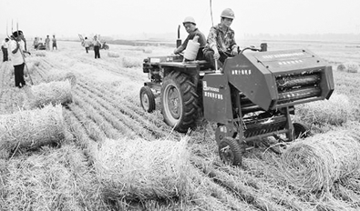 黑龍江省2015年秸稈產(chǎn)量高達7200萬噸,如何推動秸稈綜合利用成為當?shù)匾粋€亟待解決的問題。圖為農(nóng)民在對秸稈進行打捆作業(yè)。