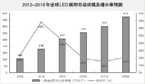 由于替代性光源和全球白熾燈替換熱潮的推動(dòng),2014年全球LED照明市場快速增長,但是2015年由于替代性光源產(chǎn)品(含燈管、球泡燈)等產(chǎn)品價(jià)格大幅下跌,產(chǎn)品利潤不如預(yù)期,使得LED照明市場增長動(dòng)力不足。LED照明市場規(guī)模增長有所放緩,2015年全球LED照明市場規(guī)模為257億美元,同比2014年增長44%,LED照明市場滲透率達(dá)到31%。預(yù)計(jì)2016年到2018年全球LED照明市場增長逐漸趨于穩(wěn)定,部分替代性光源已經(jīng)更換完成,市場增長率穩(wěn)定在20%左右。照明企業(yè)開始把重心轉(zhuǎn)移到專業(yè)照明領(lǐng)域,如商業(yè)照明、工程照明和建筑照明等。