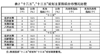 第一,“十三五”規(guī)劃增加了綠色發(fā)展指標(biāo)。從歷次五年規(guī)劃的綠色發(fā)展指標(biāo)看,“十一五”規(guī)劃有7個(gè)(實(shí)有8個(gè));“十二五”規(guī)劃有8個(gè)(實(shí)有12個(gè)); “十三五”規(guī)劃進(jìn)一步提高至10個(gè)(實(shí)有指標(biāo)33個(gè))。從歷次五年規(guī)劃的綠色發(fā)展指標(biāo)占實(shí)有指標(biāo)總數(shù)的比重來(lái)看,“十一五”規(guī)劃的比例為34.8%,“十二五”規(guī)劃提高至42.9%,“十三五”規(guī)劃又進(jìn)一步提高至48.5%。從實(shí)有約束性指標(biāo)來(lái)看,“十一五”規(guī)劃只有6項(xiàng)指標(biāo),“十二五”規(guī)劃有11項(xiàng), “十三五”規(guī)劃16項(xiàng)實(shí)有指標(biāo)全部為約束性指標(biāo)(見(jiàn)表2)。這就會(huì)極大地強(qiáng)化各級(jí)政府履行環(huán)境保護(hù)職責(zé)的約束機(jī)制,保障如期完成綠色發(fā)展指標(biāo),甚至可以超額完成綠色發(fā)展指標(biāo)。