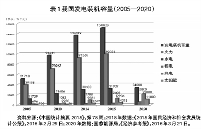 “十二五”規(guī)劃明確提出“資源節(jié)約環(huán)保成效顯著”的核心目標(biāo),進(jìn)一步強(qiáng)化健全了節(jié)能減排激勵(lì)約束機(jī)制。隨著我國(guó)經(jīng)濟(jì)發(fā)展進(jìn)入新常態(tài),從高增長(zhǎng)轉(zhuǎn)向中高增長(zhǎng),經(jīng)濟(jì)發(fā)展方式加快轉(zhuǎn)變,綠色發(fā)展取得明顯成效,主要資源環(huán)境指標(biāo)全部超額完成,尤其是出現(xiàn)了主要污染物排放總量大幅度下降,清潔能源發(fā)電裝機(jī)容量大幅度增長(zhǎng)(見(jiàn)表1),成為世界最大的生產(chǎn)國(guó)、消費(fèi)國(guó),煤炭消費(fèi)、二氧化碳排放出現(xiàn)了負(fù)增長(zhǎng),這就為提前到達(dá)中國(guó)環(huán)境庫(kù)茨涅茲曲線(xiàn)拐點(diǎn),實(shí)現(xiàn)經(jīng)濟(jì)增長(zhǎng)與主要污染物排放量脫鉤,進(jìn)一步改善生態(tài)環(huán)境創(chuàng)造了條件。