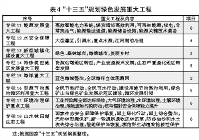 第四,推進(jìn)國(guó)家重大工程建設(shè)?!毒V要》專(zhuān)門(mén)提出了綠色發(fā)展八類(lèi)重大工程,共計(jì)39個(gè)項(xiàng)(見(jiàn)表4)。這是迄今為止中國(guó)最大的生態(tài)投資,5年累計(jì)額相當(dāng)于“十二五”的兩倍之多,更是未來(lái)5年世界最大規(guī)模的綠色投資。這些工程項(xiàng)目具有全局性、基礎(chǔ)性、公益性,既針對(duì)我國(guó)生態(tài)環(huán)境建設(shè)的薄弱環(huán)節(jié),又是具有帶動(dòng)性、外溢性的有效投資,是通過(guò)物質(zhì)資本、科技資本、人力資本對(duì)生態(tài)系統(tǒng)進(jìn)行生態(tài)投資,起到“前人種樹(shù),后人乘涼”的綠色發(fā)展、綠色投資、綠色就業(yè)、綠色消費(fèi)、綠色創(chuàng)新的綜合性作用,為下一個(gè)五年乃至更長(zhǎng)時(shí)期的經(jīng)濟(jì)社會(huì)生態(tài)永續(xù)發(fā)展夯實(shí)基礎(chǔ)。