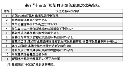 第二,“十三五”規(guī)劃專(zhuān)門(mén)列出了綠色發(fā)展次優(yōu)先指標(biāo),共計(jì)11個(gè)(見(jiàn)表3),同樣具有約束性。形象地講,中國(guó)的五年規(guī)劃是越來(lái)越綠色的規(guī)劃,這會(huì)起到促進(jìn)綠色發(fā)展“指揮棒”的引導(dǎo)作用。
