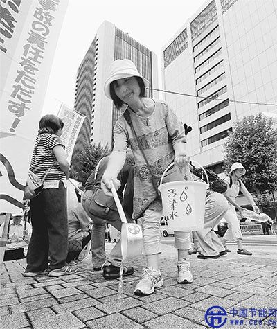 8月8日,日本福島民眾舉行示威,抗議東京電力公司將核污水排入大海。圖為福島居民和示威者把“污染水”倒在地上,以此模仿東電公司把污水排入大海。