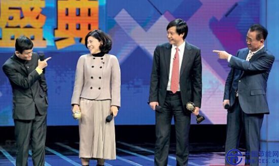 2013年12月12日,北京,董明珠與雷軍出席2013年度經(jīng)濟(jì)人物頒獎(jiǎng)典禮時(shí)立了個(gè)10億的賭約。左起:馬云,董明珠,雷軍,王健林