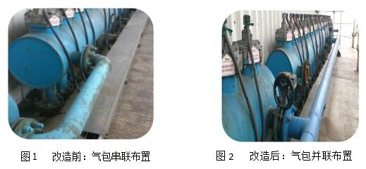 2)將各分室噴吹氣包由串聯(lián)布置改為并聯(lián)。見圖1、圖2。