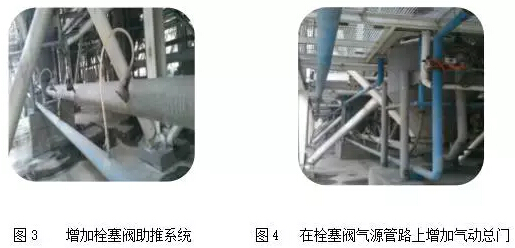 1)因#4爐輸灰管線較長,曾出現(xiàn)過輸灰管道堵塞影響機組負(fù)荷的異常事件,之后在#4爐一電場輸灰管道上增設(shè)了栓塞閥助推系統(tǒng),并在栓塞閥氣源管路上增加了氣動總門,根據(jù)機組負(fù)荷、灰量適時投入栓塞閥助推系統(tǒng)。(見圖3、圖4)