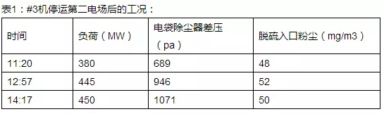 電袋除塵器的主要優(yōu)點是除塵效率高效穩(wěn)定、荷電粉塵的特殊性質(zhì)有效降低了濾袋差壓,這些特點為低負(fù)荷停運部分電場創(chuàng)造了條件。于是進(jìn)行了低負(fù)荷時停運第二電場的試驗。