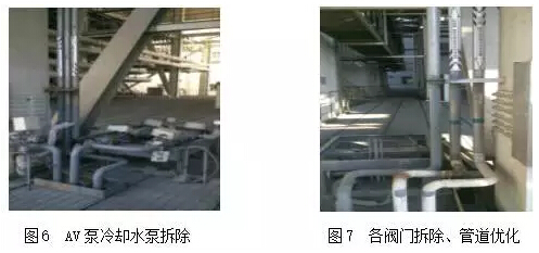 原設(shè)計中,省煤器、脫硝灰斗倉泵冷卻水設(shè)置有增壓泵。運行實踐表明,此泵故障率高,存在易超電流、易泄漏、冬季管路存水易上凍等問題;同時,一般爐側(cè)開式水壓力為0.5MPa,完全滿足省煤器、脫硝灰斗倉泵冷卻水需要,故對該泵進(jìn)行改造,共分三個步驟:進(jìn)行停泵試驗、拆除增壓泵、拆除各閥門并優(yōu)化管路。(詳見圖6、圖7)