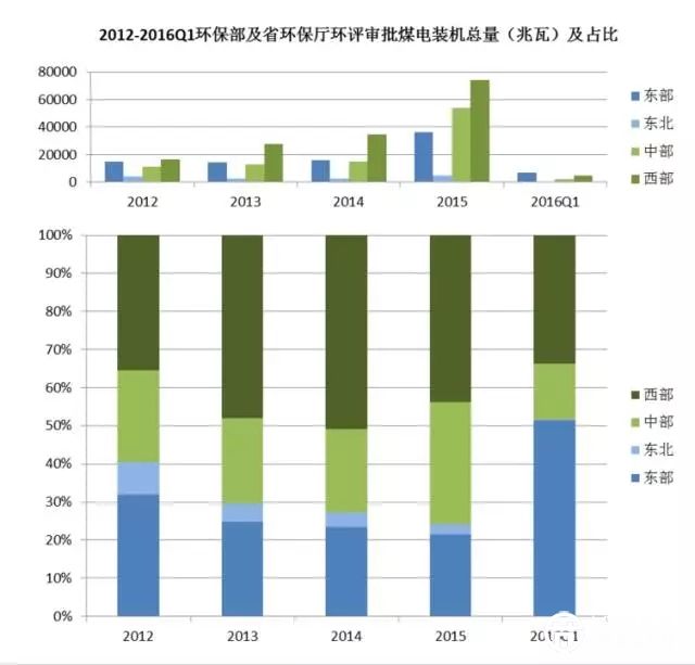 而這樣的結(jié)論背后,是有數(shù)據(jù)支撐的!2012年至2015年,通過環(huán)保部和省環(huán)保廳環(huán)評審批的中西部燃煤電廠裝機(jī)量占比不斷上升。2015年中西部地區(qū)環(huán)保部及省環(huán)保廳審批燃煤發(fā)電廠裝機(jī)量為128GW,占全國審批煤電裝機(jī)總量的75%。