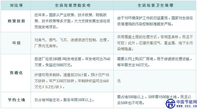 相較于衛(wèi)生填埋方式,焚燒發(fā)電在政策扶持、節(jié)能減排、節(jié)約土地等方面更有優(yōu)勢,以某地900噸/天焚燒發(fā)電廠項(xiàng)目為例說明: