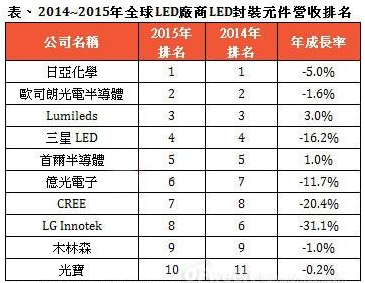 全球LED產(chǎn)業(yè)競(jìng)爭(zhēng)激烈,2015年全球LED廠商排名出現(xiàn)洗牌。據(jù)全球LED廠商的LED封裝元件營(yíng)收排名顯示,2015年日亞化學(xué)依舊盤據(jù)龍頭地位,歐司朗光電半導(dǎo)體(OSRAMOpto.)、Lumileds則緊追在后。三星等韓系廠商則因背光應(yīng)用衰退、殺價(jià)競(jìng)爭(zhēng)激烈,使得營(yíng)收普遍呈現(xiàn)衰退。由于LED價(jià)格競(jìng)爭(zhēng)激烈,多數(shù)LED廠商營(yíng)收出現(xiàn)下滑。加上美元升值的影響,部分廠商營(yíng)收表現(xiàn)換算成美元之后反而呈現(xiàn)衰退的現(xiàn)象。