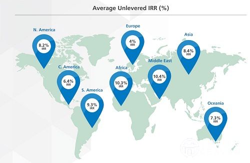 莫卡特斯中心平臺上,非洲和中東地區(qū)太陽能項目平均能帶來超10%的收益率,這是歐洲4%收益率的2倍多。