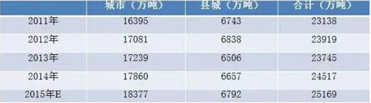 隨著國民經(jīng)濟(jì)的持續(xù)高速發(fā)展和城鎮(zhèn)化進(jìn)程的快速推進(jìn),城市生活垃圾的產(chǎn)出量也在以驚人的速度增長。2014年,我國城市生活垃圾清運(yùn)量為1.79億噸,縣城生活垃圾清運(yùn)量為6657萬噸,合計(jì)2.45億噸。2015年,我國垃圾收集和垃圾轉(zhuǎn)運(yùn)行業(yè)市場規(guī)模為252億元。