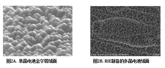 (1)減小入射光反射率:又可分成表面絨面織構(gòu)化和減反射膜兩個(gè)方面。表面絨面織構(gòu)化最典型的應(yīng)用就是堿制絨制備單晶硅電池的金字塔絨面結(jié)構(gòu)。采用選擇性腐蝕NaOH溶液,利用腐蝕液對(duì)各個(gè)晶面腐蝕速率的不同,形成非均勻腐蝕,在硅表面形成類似金字塔形狀的絨面,如圖2A。制得絨面的反射率可達(dá)到10%左右。依靠表面金字塔形的絨面結(jié)構(gòu),對(duì)光進(jìn)行多次反射,不僅減少了反射損失,而且改變了光在硅中的前進(jìn)方向,延長(zhǎng)了光程,增加了光生載流子的產(chǎn)量;曲折的絨面又增加了結(jié)面積,從而增加對(duì)光生載流子的收集率。對(duì)于多晶硅電池而言,由于硅片晶粒晶向的不均勻,無(wú)法使用堿制絨。為有效降低絨面反射率,目前已經(jīng)有反應(yīng)離子刻蝕(RIE)或者濕法納米黑硅技術(shù)應(yīng)用到規(guī)?;a(chǎn)中。RIE通常使用SF6/O2混合工藝氣體,在蝕刻過(guò)程中,F(xiàn)自由基對(duì)硅進(jìn)行化學(xué)蝕刻形成可揮發(fā)的SiF,O自由基形成SixOyFz對(duì)側(cè)墻進(jìn)行鈍化處理,形成絨面結(jié)構(gòu),如圖2B。其絨面反射率可達(dá)到4%以下。
