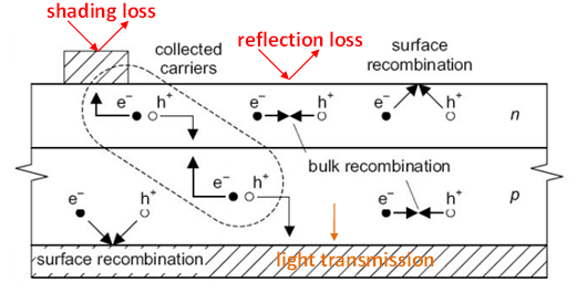 (1)光學(xué)損失,包括電池前表面反射損失、正面電極的遮光損失以及長(zhǎng)波段的非吸收透射損失。