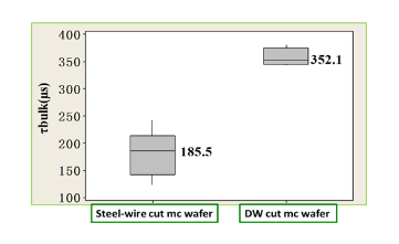 圖9所示的雙面鈍化的少子壽命測(cè)試表明,金剛線多晶硅片具有較高的體少子壽命,達(dá)到350us左右,優(yōu)于常規(guī)砂漿線多晶硅片。這樣就從基礎(chǔ)上保證了高效多晶電池的轉(zhuǎn)換效率。