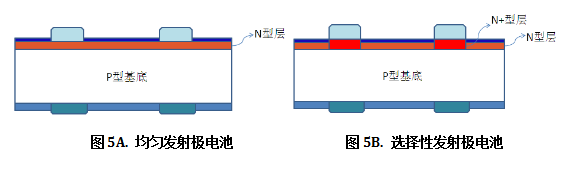 晶體硅電池的擴(kuò)散層屬于摻雜較重的區(qū)域,相比于電池的基底區(qū)域,少數(shù)載流子復(fù)合較為嚴(yán)重。降低擴(kuò)散層的摻雜濃度能夠有效降低少數(shù)載流子復(fù)合,提高電池的開(kāi)路電壓和短路電流。高阻密柵(高擴(kuò)散方阻、多細(xì)柵線數(shù)目)技術(shù)是目前業(yè)內(nèi)普遍應(yīng)用的技術(shù)手段。高阻密柵技術(shù)通過(guò)提高電池?cái)U(kuò)散層的方塊電阻,降低擴(kuò)散層的表面摻雜濃度以及總的摻雜濃度,最終提高開(kāi)路電壓和短路電流。不過(guò)由于橫向電阻增加以及表面濃度降低,該技術(shù)需要犧牲一部分填充因子。選擇性發(fā)射極技術(shù)能夠同時(shí)兼顧高擴(kuò)散層方塊電阻以及填充因子,該技術(shù)在電極區(qū)域形成的是重?fù)诫s的N型層,極大降低了與金屬電極的接觸電阻,有益于改善填充因子,同時(shí)在受光區(qū)形成的是輕摻雜的N型層,能有效降低N型層的載流子復(fù)合,改善短波段的光譜響應(yīng),提高開(kāi)路電壓和短路電流。2010左右,該技術(shù)在業(yè)內(nèi)曾非常熱門(mén),當(dāng)時(shí)與均勻發(fā)射極電池相比,轉(zhuǎn)換效率能夠提高0.2個(gè)百分點(diǎn)左右。近幾年由于漿料的性能不斷改進(jìn),選擇性發(fā)射極的優(yōu)勢(shì)越來(lái)越小,個(gè)別選擇性發(fā)射極技術(shù)如硅墨技術(shù)、激光選擇性發(fā)射極逐漸被淘汰出局。