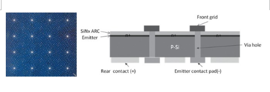 (2)減小正面電極遮光損失:新型正面電極結(jié)構(gòu)例如MWT(MetalWrapThrough)電池,它通過(guò)激光穿孔和灌孔印刷技術(shù)將正面發(fā)射極的接觸電極穿過(guò)硅片基體引導(dǎo)到硅片背面,通過(guò)16個(gè)電極孔收集光生電流,如圖3所示,直接減少了主柵的遮光面積。在MWT電池組件的封裝技術(shù)中,導(dǎo)電膠的采用將背面正負(fù)極同時(shí)與基板連接,這樣增加堆積密度,不僅方便安全,而且也減少FF損失和提高Jsc(分別大約2.5%和1.6%)。