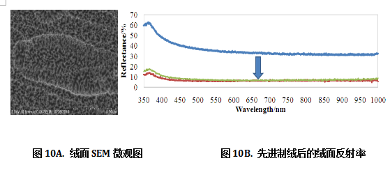 經(jīng)過(guò)先進(jìn)制絨技術(shù)手段得到的絨面尺寸在亞微米范圍。從SEM圖片(圖10A)觀察,制絨后的絨面在蟲(chóng)卵形凹坑內(nèi)部還有許許多多微小的丘陵結(jié)構(gòu),入射光在蟲(chóng)卵凹坑內(nèi)的微型丘陵結(jié)構(gòu)表面處形成多次反射,從而極大降低制絨后的反射率。和常規(guī)酸制絨相比,其平均反射率能夠降低到10%以下。