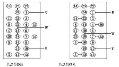 3.4 循環(huán)水泵高低速運行,我廠對3A、4B循環(huán)水泵進行了高低速改造,并制定了夏季冬季循環(huán)水泵運行方案。這種方式和變頻方式比較的優(yōu)點是投資小,運行方式靈活,改造后低速運行電流由400A降至293A,節(jié)能效果顯著。在機殼南側(cè)部位,重新設(shè)置一個雙速切換的出線箱,通過改變接線端子上連接片的連接位置,即可改變電動機的極數(shù),從而達到改變轉(zhuǎn)速的目的,整個電氣系統(tǒng)不必變動。如下圖: