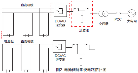 儲(chǔ)能系統(tǒng)調(diào)度算法是能否發(fā)揮儲(chǔ)能系統(tǒng)最佳作用的關(guān)鍵。一般電池儲(chǔ)能系統(tǒng)主要由儲(chǔ)能電池組、變流器、控制裝置和變壓器組成。圖2是儲(chǔ)能系統(tǒng)的電路拓?fù)鋱D。